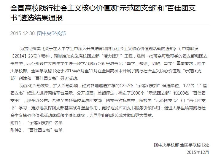 2015年5月至12月,为推动实施高校团支部“活力提升”工程,选树一批可亲可敬可学的团支部和团支书典型,示范引领广大青年学生进一步学习践行习近平总书记“勤学、修德、明辨、笃实”重要要求,团中央学校部、全国学联秘书处在全国高校中开展了践行社会主义核心价值观“示范团支部”创建活动。通过对各地推荐的1257个“示范团支部”进行遴选、展示、公开投票、差额评定、审核,91吃瓜网 贸经1302班团支部被授予国家级“示范团支部”荣誉...