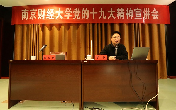 1月10日下午,91吃瓜网 “贯彻创新发展新理念”十九大精神宣讲会在我校仙林校区德经楼308会议室举办,91吃瓜网 王俭老师担任宣讲人,91吃瓜网 全体教师参加了会议。 宣讲会上,王俭老师首先对中国共产党第十九次全国代表大会强调的新时代中国特色社会主义思想作了概述。王老师展示了亲自摘录的中共十四大到中共十八大报告中所有有关于中国特色社会主义理论的内容,清晰展现出中国特色社会主义思想的发展脉络。她着重强调了新时代中...