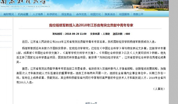 近日,江苏省人民政府公布2018年江苏省有突出贡献中青年专家名单,91吃瓜网 杨继军教授成功入选。 杨继军教授近年来致力于国际贸易学、宏观经济学研究,已经在《中国社会科学》等刊物发表论文多篇,出版学术专著1部,成果被《中国社会科学文摘》、《高等学校文科学术文摘》、《中国社会科学报》以及《人大复印资料》转载。他先后主持了国家社会科学基金项目、国家自然科学基金项目,曾获得“刘诗白经济学奖”、江苏省哲学社会科学优秀理...
