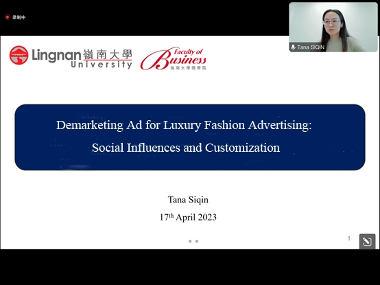 邀请,香港岭南大学斯琴塔娜副教授做了题为“Demarketing Ad for Luxury Fashion Advertising: Social Influences and Customization”线上学术讲座,国贸学院管理科学与工程等专业研究生和部分老师及学生参加了此次讲座。