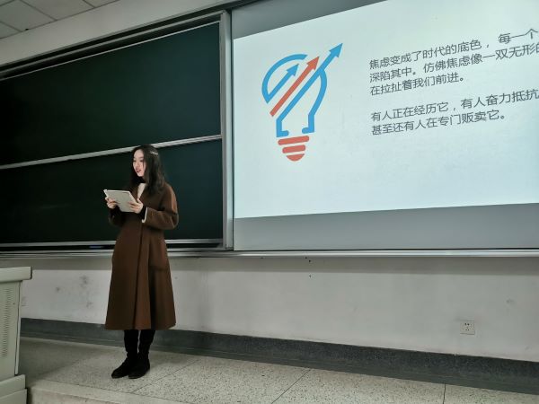 首先,华解语风趣地将焦虑以垃圾分类的形式,分为“可回收焦虑”、“易腐焦虑”、“有害焦虑”等。在阐述焦虑种类的过程中,她向同学们举例了生活中常见的焦虑,例如身材焦虑、容貌焦虑、学历焦虑等。她着眼于生活中许多小细节,从中发掘出了一系列真正带来焦虑的东西,使大家对焦虑的种类有了更进一步的了解。除此之外,她还以自身作为例子,从自己会因为不能在恰好的时候品尝想要的美食从而产生焦虑这一点出发,进一步引出产生焦虑的原因,提出了“焦虑往往是我们自己创造的”的观点。“我的焦虑是由我自己创造的,我的焦虑也只有我自己能化解。因此我们也必须掌握它。”华解语这样说道, “要活得有控制感,延迟满足,学会做减法。” 她就“自律”与“焦虑”两者的关系、根本内涵做了全新的解读。