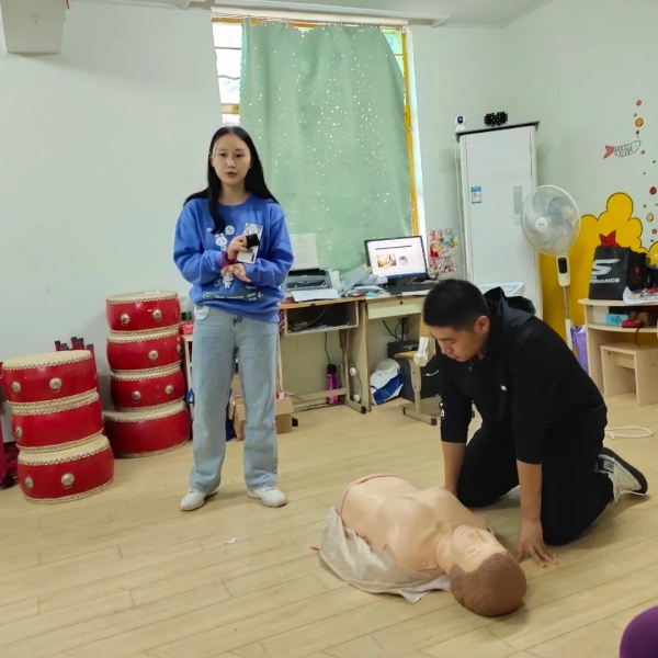 而在志愿者李鑫与张东赫教授心肺复苏急救知识时,初始学员们脸上带有迷茫的表情,但在志愿者示范过心肺复苏之后,一些学生跃跃欲试,“李老师我想来试一试!”一位小女孩主动向志愿者申请,然而相较于学习过相关技能的志愿者,小女孩的做出了一些错误的动作。“大家记住了,在按压胸部的时候,手臂一定要伸直的。”在志愿者们的帮助以及详细的讲解之下,学员们基本了解了心肺复苏的程序。看着学员们积极参与互动的高兴模样志愿者们很是欣慰。志愿者李鑫表示:“教育部近日提出急救知识纳入学校健康教育。博爱之家的学生们对于健康知识、急救常识了解的少。一旦发生意外,很难有效帮助自己或者作出正确选择。因此,我们希望能将急救知识作为一个教学,融入课堂,并针对这些学生进行形象生动的科普教学。”