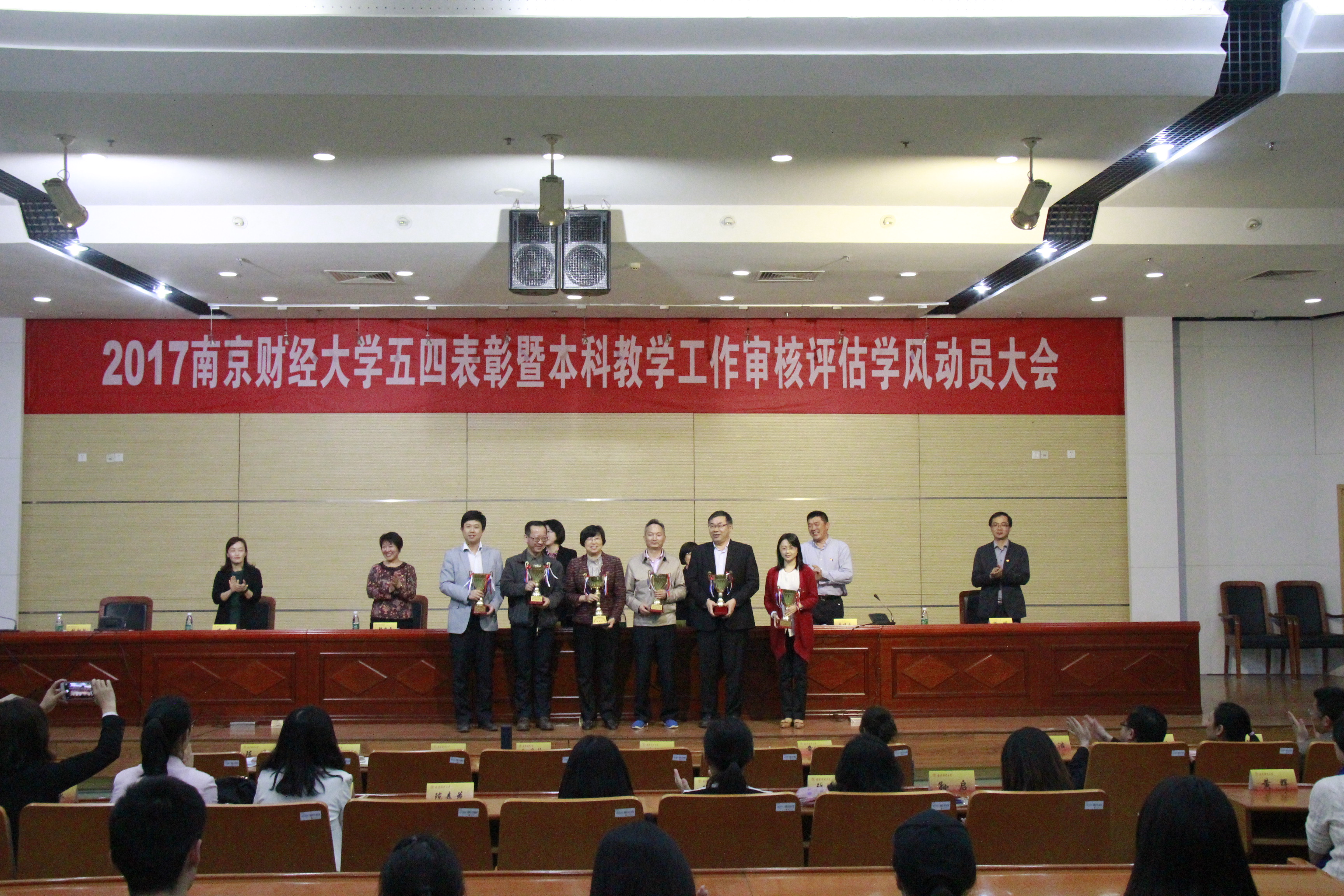 五四表彰暨本科教学工作审核评估学风动员大会在我校仙林校区图书馆报告厅隆重举行,副校长邱伟芬出席会议,党校办、党委组织部、党委宣传部、党委学生工作部、党委保卫部、团委、教务处负责人,各学院党委(总支)书记、副书记,各学院团委书记、副书记、专职团干,校学生会主席团成员,各学院学生会主席,团员代表,获奖人员代表参加了此次大会。