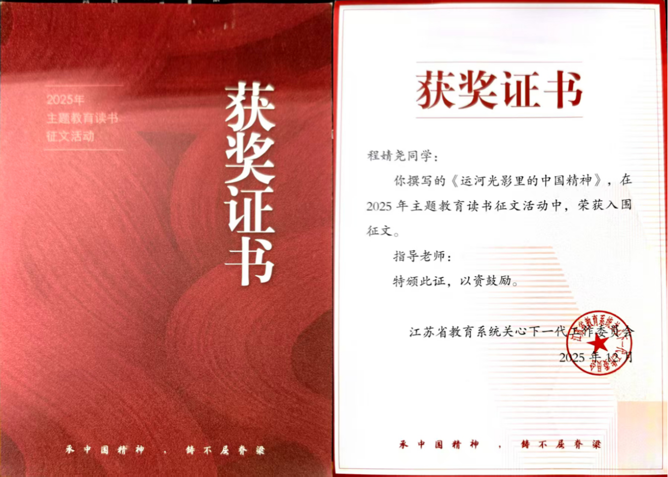 2.程婧尧同学的《运河光影里的中国精神》入选江苏省教育系统关工委2025年主题教育读书征文活动入围征文。