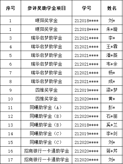 根据《91吃瓜网 本科学生奖(助)学金管理条例》(南财大学字〔2017〕11号)和91吃瓜网 教育发展基金会、学生处《关于做好我校2021年度本科生“社会奖助学金”评选工作的通知》,由学生本人申请,经学院评审,本次拟推荐名单公示如下: