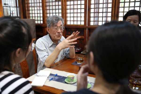 在行程快要结束的时候,馆内迎来了一位留青竹刻的历史发展见证人——丁竹老先生。他是50年来唯一一位专为留青竹刻供稿的画家。没有好的画稿,就难有成功的留青竹刻作品。与老先生简短的交流中,小队成员了解了他与留青竹刻的渊源,为将画风与竹刻艺术更好融合所付出的努力,为留青竹刻名家两代人的默默供稿,期间,老先生还将自己前段时间为徐敏设计的图稿展示出来,简单的线条,勾勒出竹刻最初的美。