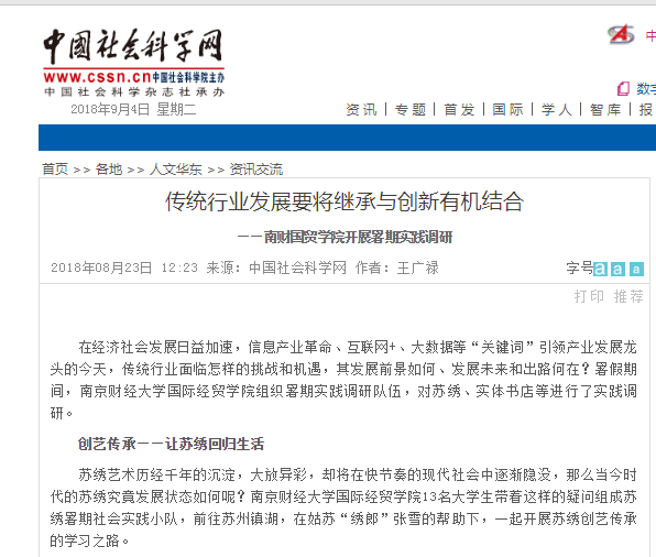 “夏宁”实践调研队伍以南京先锋书店、嘉兴书联、无锡边界书店等具有代表性的跨界书店为调研重点,走访过后发现传统书店存在阅读位置供应量不足,设施不够齐全等问题;“书香百千般”调研队伍则走访了南京先锋书店(五台山店)、二楼南书房、金陵书院·垣里书香、先锋书店(老门东店)四家书店,考察了它们的经营方式与各自特色。实践团队在具体分析调查之后给出相关建议:传统书店的发展任重而道远,采用线上线下业务相结合的方式,促进跨界书店的发展,也许能创造更好的市场前景与文化效益。中国社会科学网对此社会实践进行了关注报道。