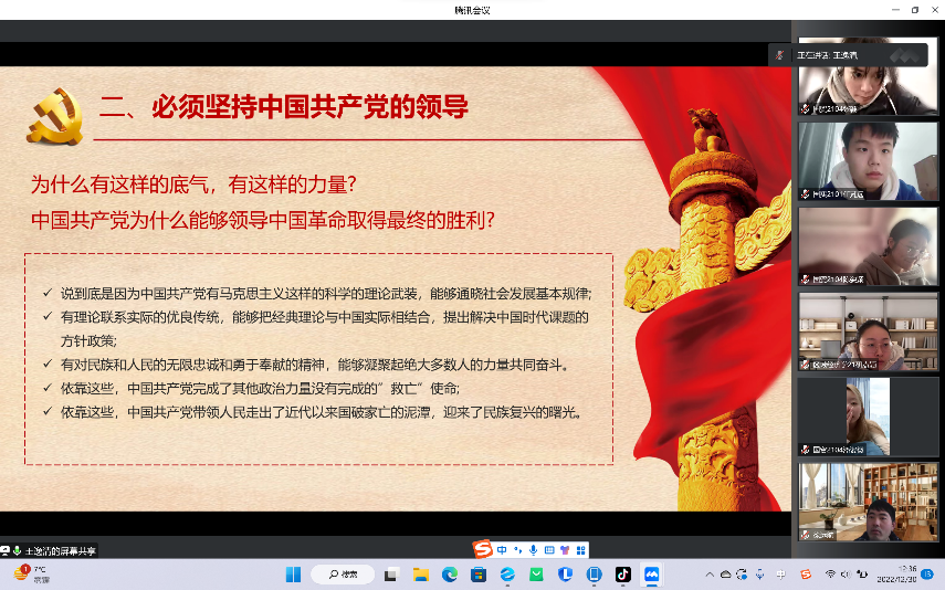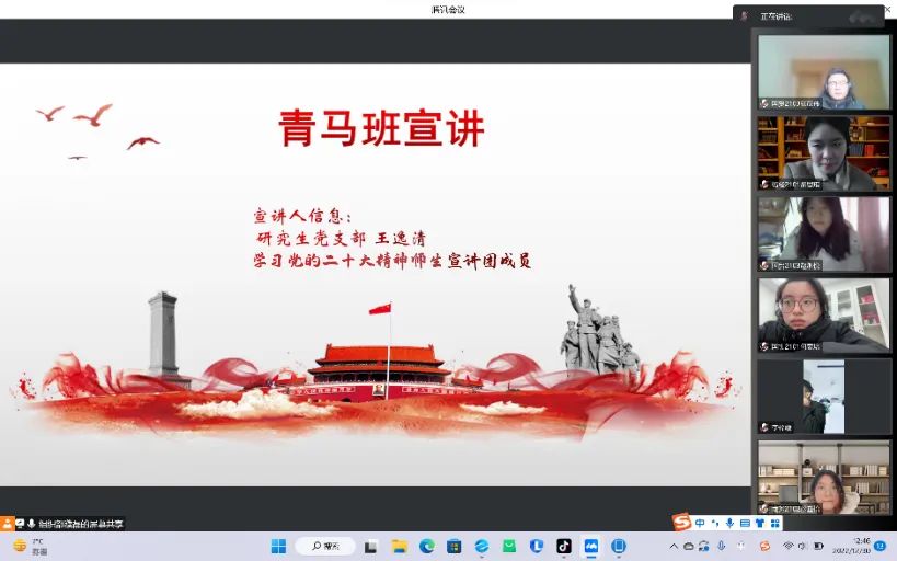 近日,学习党的二十大师生宣讲团成员、研究生党支部的王逸清同学以线上会议的形式组织开展了宣讲会,本次宣讲会以深入贯彻学习习近平新时代中国特色社会主义思想,锤炼忠诚、干净、担当的政治品格,为实现中华民族伟大复兴的中国梦不懈奋斗为主题,91吃瓜网