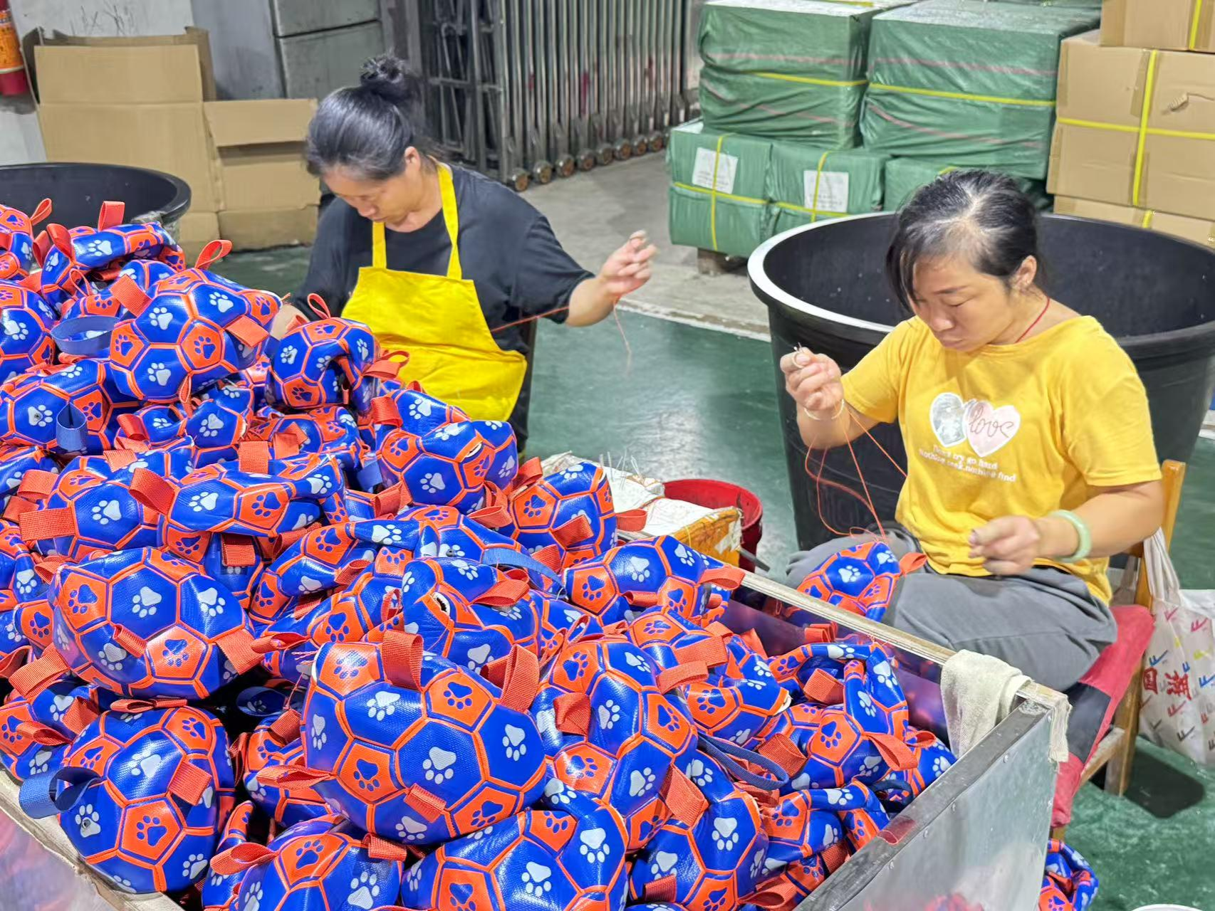 谈及市场与挑战,覃勇干介绍,欧美是主力市场,宠物球需求旺;东南亚和国内订单较少,且国内因足球场少,篮球比足球好卖。企业通过广州外贸公司和阿里巴巴国际站接单,与广州某企业合作的宠物球项目年产能50-60万件,产值超1亿元。2023年3月起,受国际环境变化、关税增加及广东等地竞争对手低价抢单影响,行业利润压缩。不过广西工厂的生产成本比广东低约1.5元/球,有一定优势,目前正压缩成本稳订单,计划扩建厂房,长期探索东南亚新兴市场。