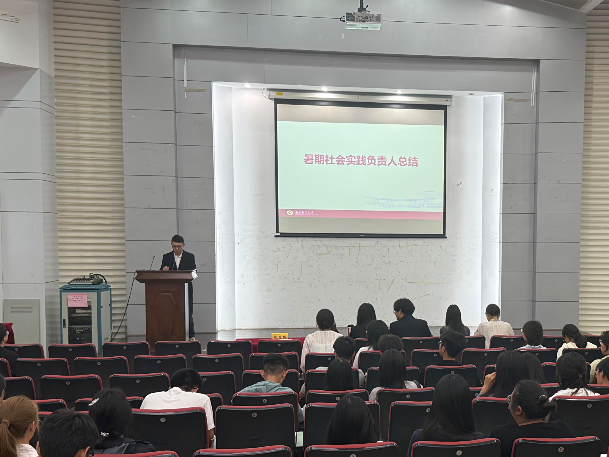 活动伊始,学院暑期社会实践总负责人凤昱博作整体汇报。他介绍道,学院高度重视大学生暑期社会实践活动,坚持引导学生主动走进实践课堂,在身体力行中深化对思政知识的理解与运用。自今年5月中旬起,学院对暑期社会实践进行了广泛宣传与全面动员,积极整合各方资源,先后组织召开暑期社会实践动员会与专题培训会,并邀请往年优秀团队及先进个人进行经验交流,为实践开展提供全过程指导。在安全保障方面,学院以“保障先行”为核心,通过动态报备机制、线上分享群等手段,全程保障实践活动的安全与高效推进。最终,全院学生参与率达100%,共计1129名同学参与,其中组建团队37支,878人以分散形式参与专业实习、顶岗锻炼及志愿服务等多种实践活动。