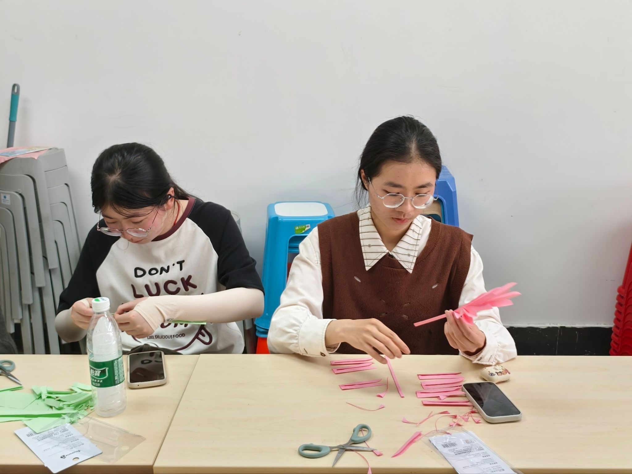 夕阳透过窗户洒进教室,光影落在彩纸上,仿佛给每一片柳叶都镀上了一层暖色,志愿者们围坐在一起,整个氛围温暖而庄重。