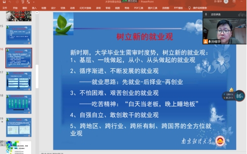 最后,孙老师借相关同学反映的问题,给出了大学生就业的应对策略,第一,要认清当前防疫形势,在“在危机中育新机、于变局中开新局。第二要从能力提升方面入手,提高自己求职择业的能力。第三要找准定位,调整好心态、审清情势变压力为动力,大学生要客观认识到现在的就业形势很严峻,应该变压力为动力,只有正视就业压力我们才会迫使自己积极行动起来,产生求胜的心理和行动。
