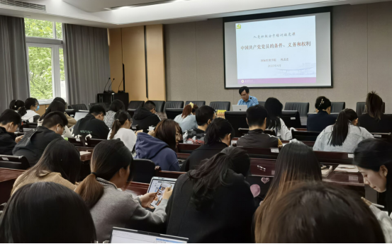 党委副书记周进进以“党员的条件、义务和权利”和“以实际行动争取做一名合格的共产党员”为主题,在德经楼308会议室给2023年上半年“党的发展对象”培训班的学员们上了一节专题党课。