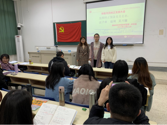 本科生第一党支部在在德经楼108教室召开预备党员转正支部大会,讨论本支部汪子欣、赵利、吴川丽3名预备党员按期转正事宜,支部大会由本科生第一党支部书记孙绪华主持,支部大会应到党员48人,实到党员48人,其中有表决权的正式党员8人,实到正式党员8人。