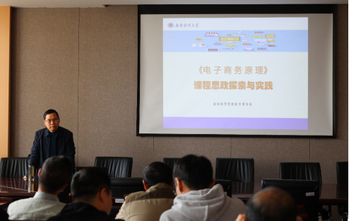 在德经楼308会议室举行第五场课程思政公开观摩活动。电子商务专业负责人杨风召教授、贸易经济系主任陈启斐副教授作课程思政建设报告。党委书记张阳军、青年骨干教师参加活动,活动由副院长杨智华主持。