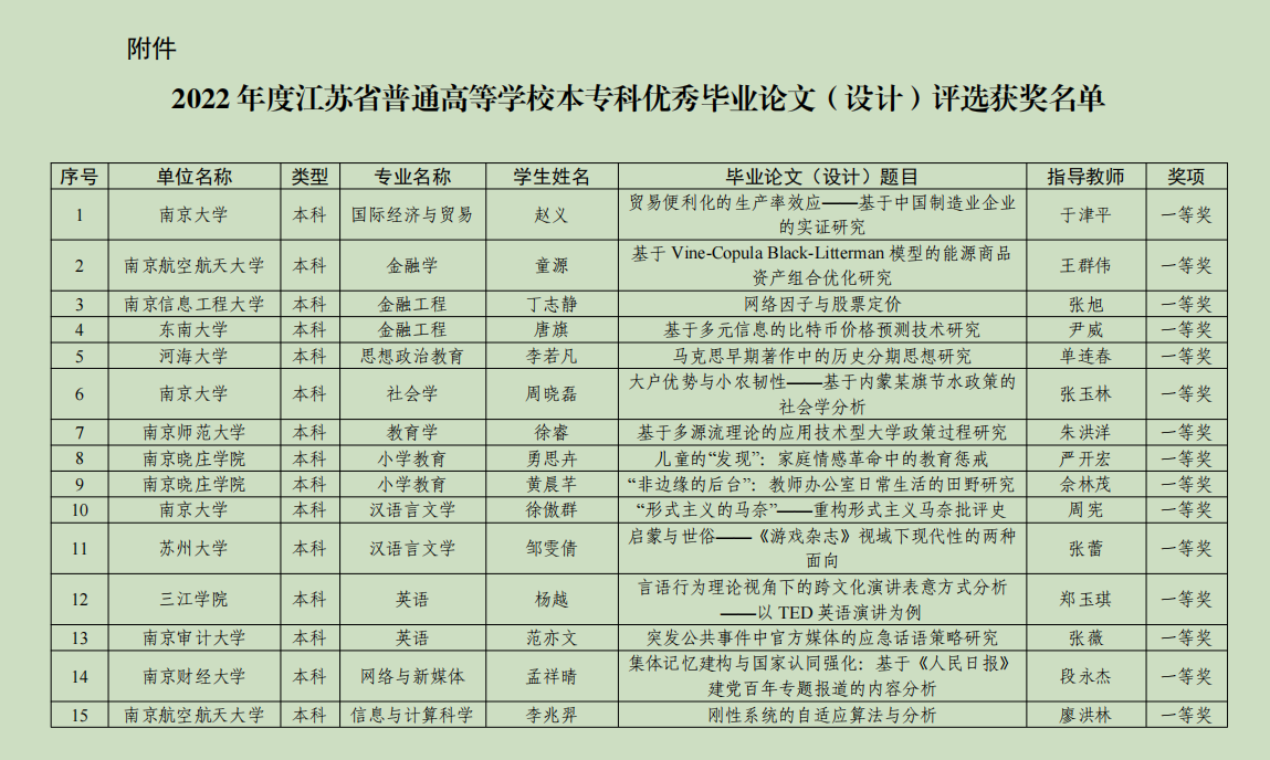 近日,江苏省教育厅发布了关于《2022年度江苏省普通高等学校优秀本专科毕业论文(设计)评定结果公示》,91吃瓜网